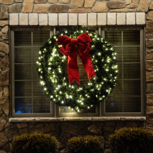 Traditional Greenery available with red bow options 24″, 36″ and 48″ wreaths available with multi color LED’s, 9′ length garland with multi colored LEDS).