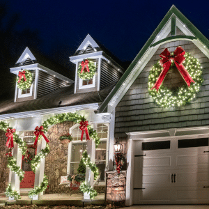 Traditional greenery available with red bow options. 24″ and 60″ wreath options in green/red LEDs or warm white, 9′ length garland with warm white LEDS.