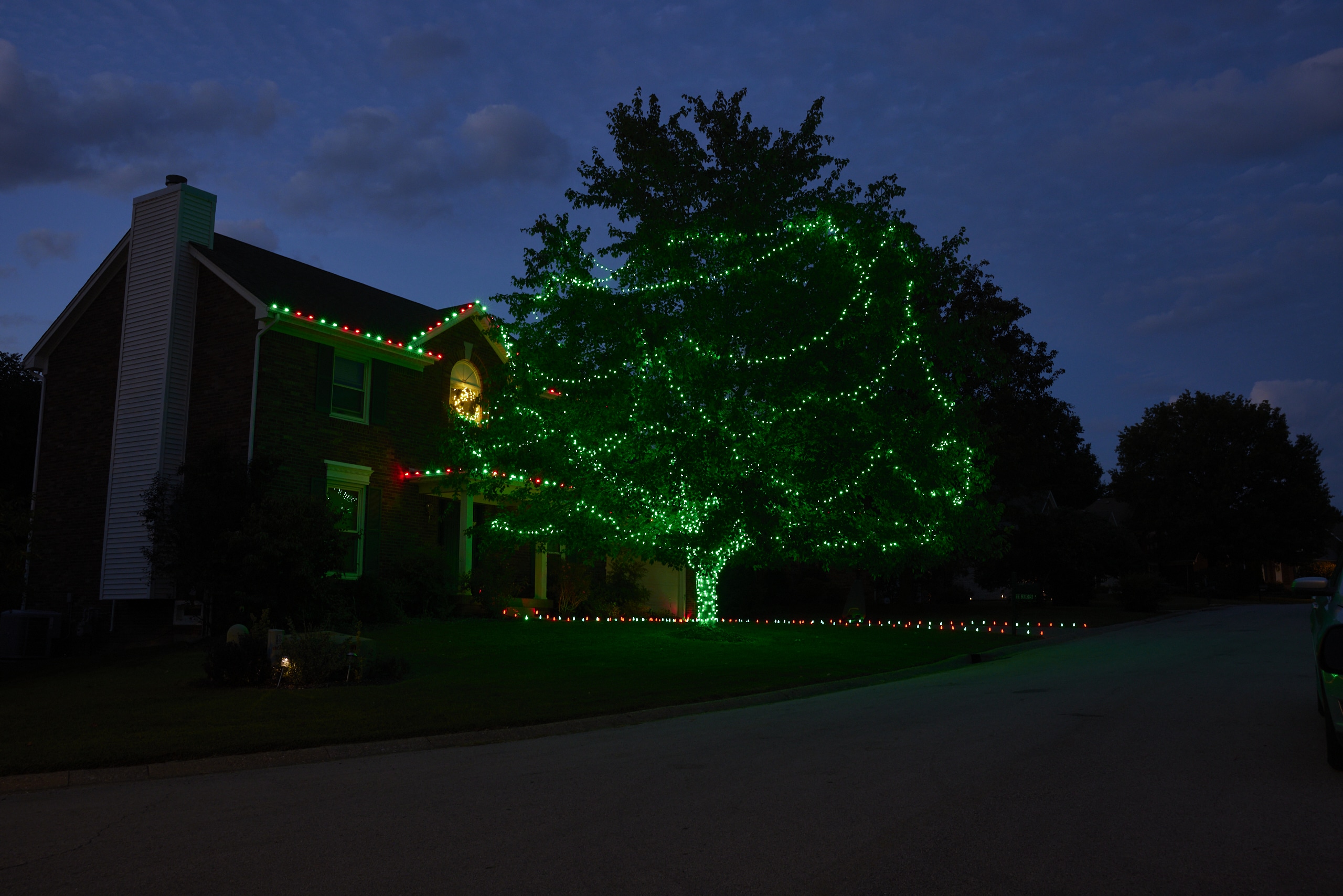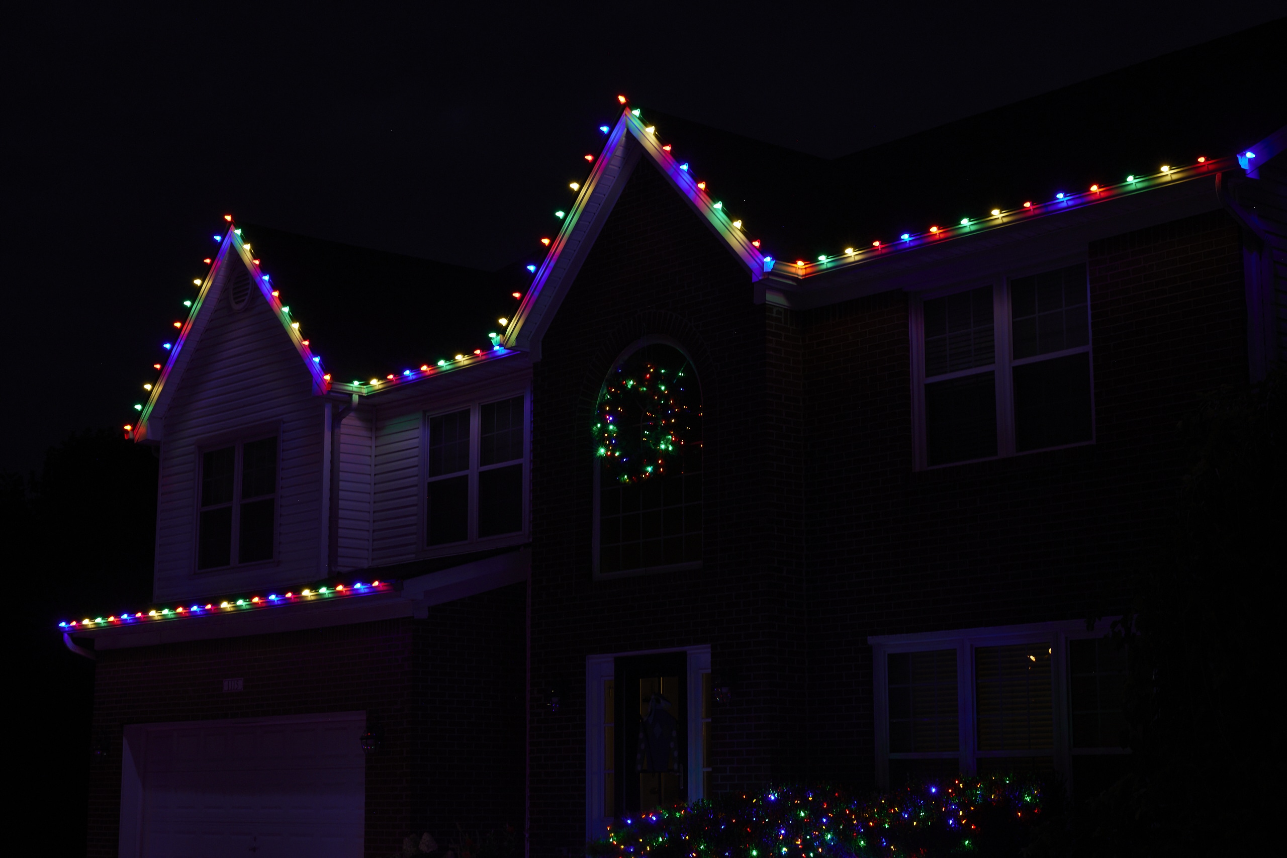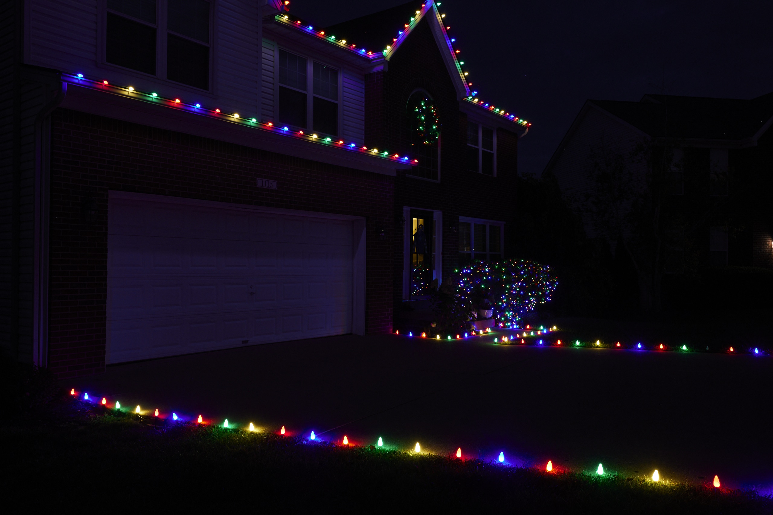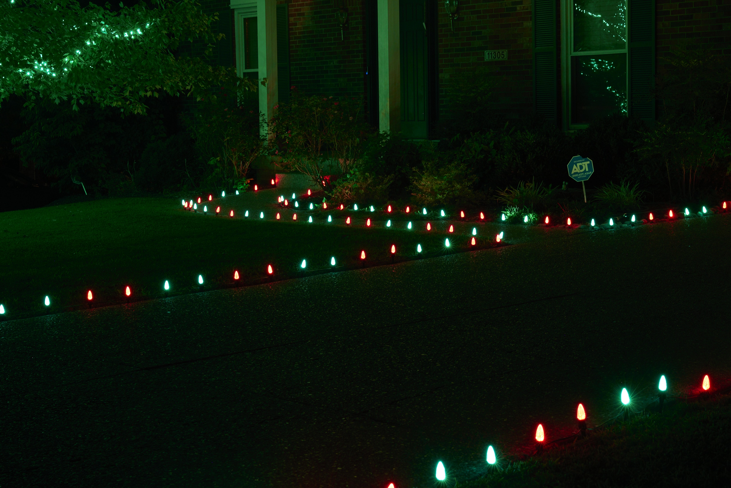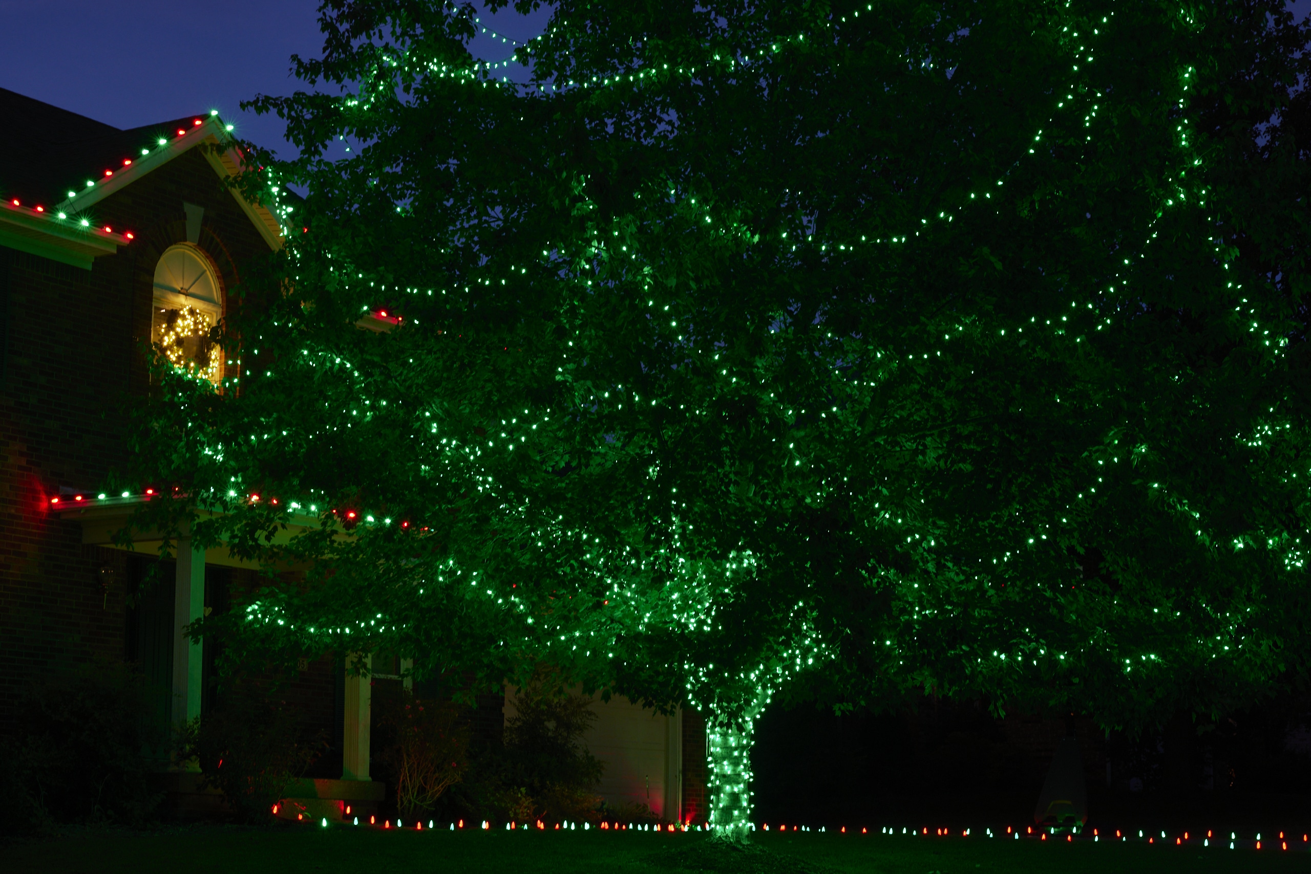 Green and red C-9 bulbs for roofline applications and green, red or white LED strands for any groundwork (trees, bushes).