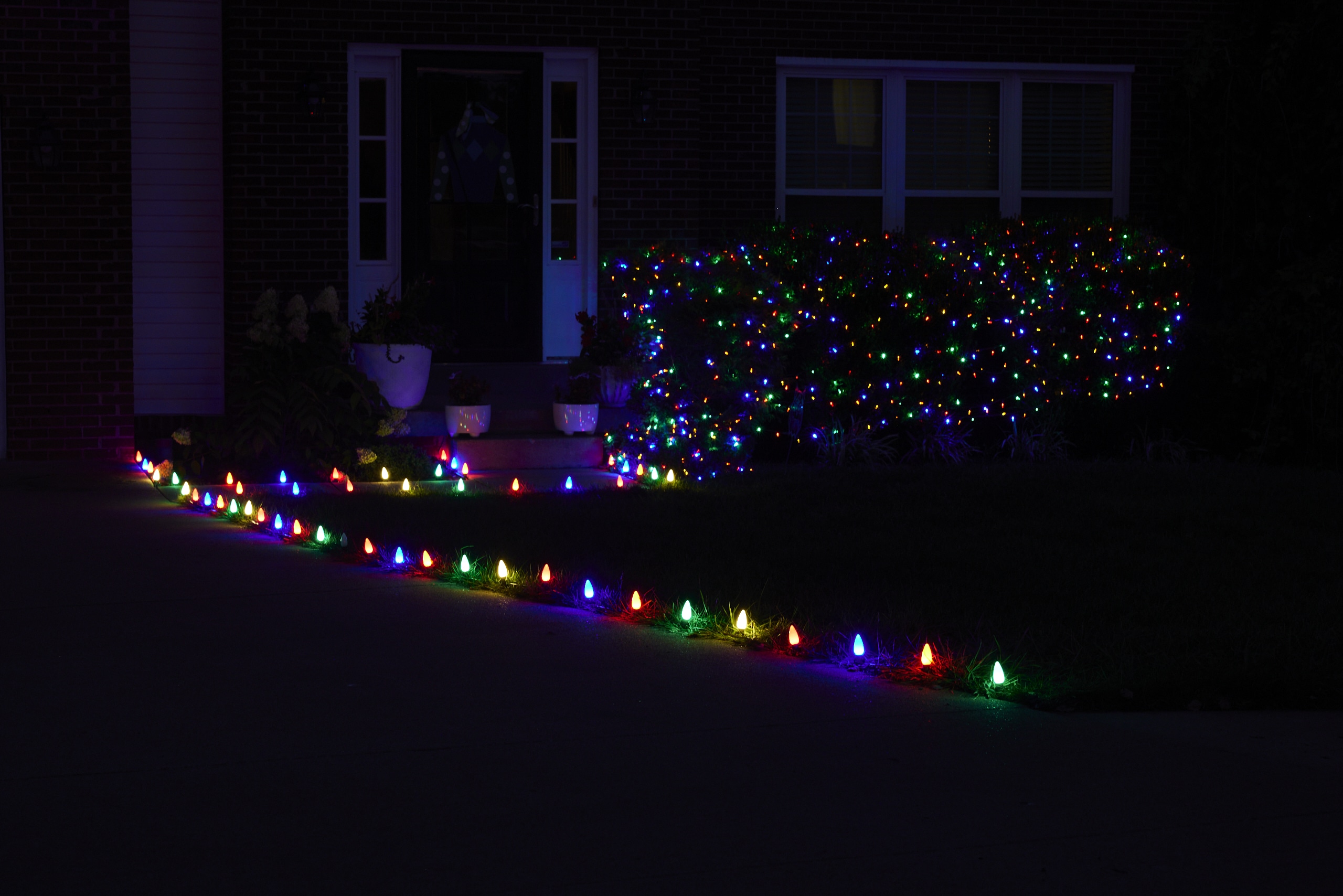White, blue, red, green and orange C9 bulbs on stakes to highlight sidewalks, driveways, etc.